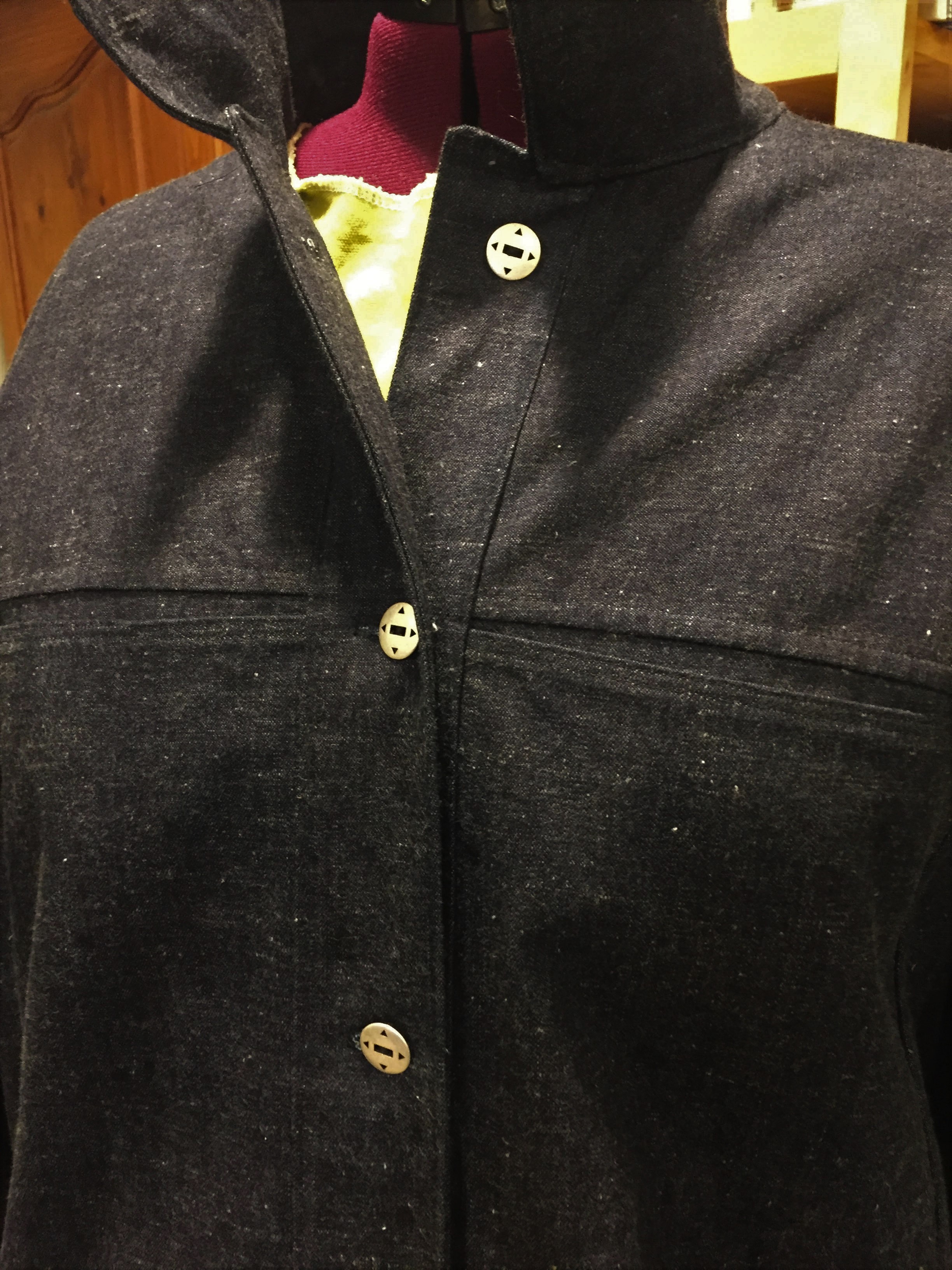The jacket has been nearly finished for a week and a half, waiting on the buttons I’d ordered to arrive. Once the buttons arrived, I sat down to sew some buttonholes. But I’d not used my newer machine to make many buttonholes, so I attempted a few trial runs. I had been fighting my machine a little bit, I’d done all the maintenance and it was working, sort of. It was not working well enough to create buttonholes, sadly. And it’s time for a spa day at the maching shop, so I’ll take it north a bit later this summer.
